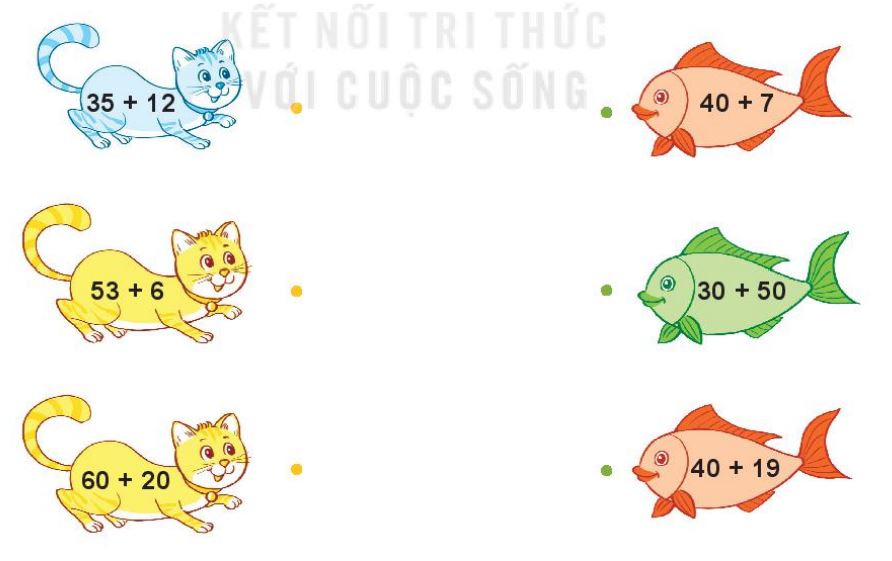 Thực hiện các phép tính ghi trên con mèo và con cá để tìm ra các phép tính có cùng kết quả.
