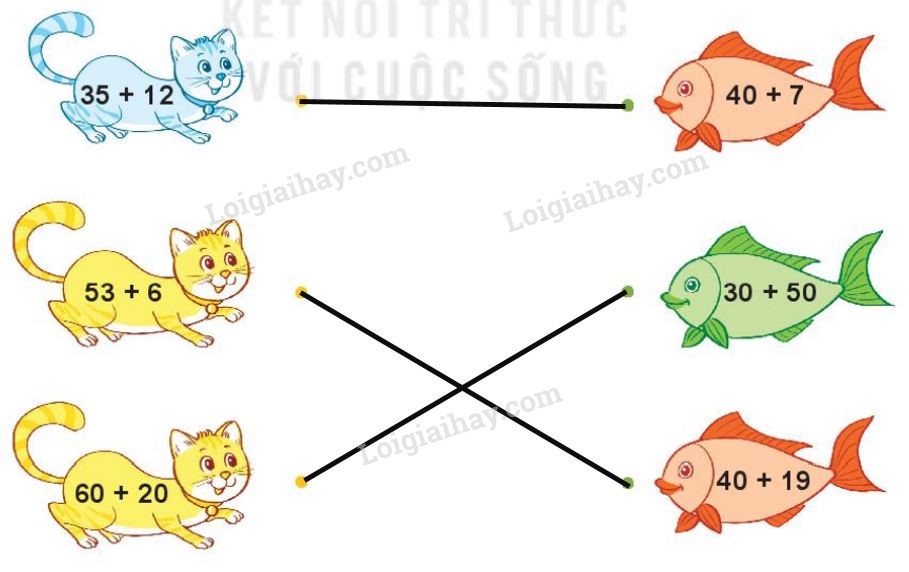 Thực hiện các phép tính ghi trên con mèo và con cá để tìm ra các phép tính có cùng kết quả.