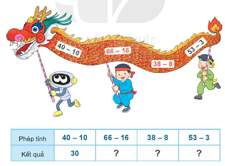 Thực hiện các phép tính ghi trên con rồng rồi điền kết quả vào bảng.