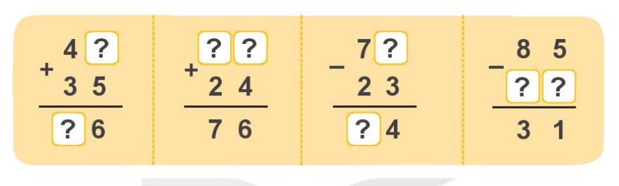 Dựa vào cách đặt tính và tính để tìm được các số cần điền.