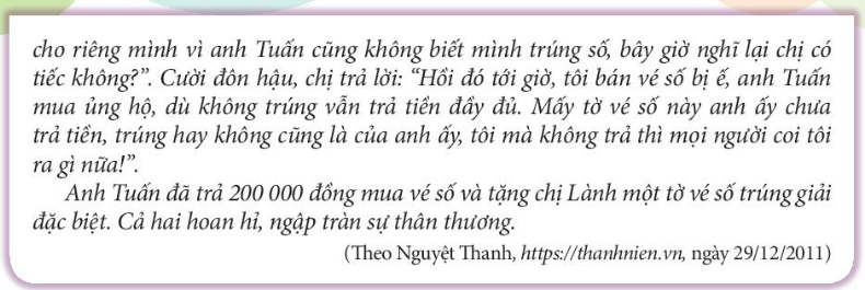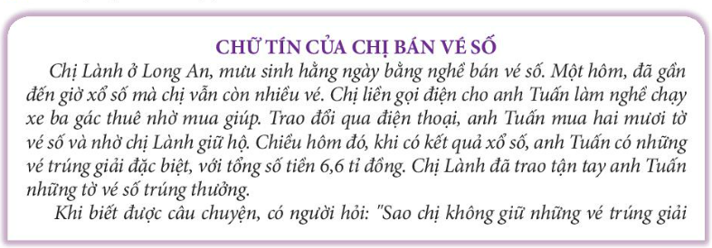 – Chi tiết trong câu chuyện cho thấy chị Lành là người giữ chữ tín là: Chị Lành biết mình đang giữ những tờ vé số trúng đặc biệt với số tiền lên đến 6,6 tỷ đồng của anh Tuấn, nhưng chị vẫn giữ hộ và trao lại cho anh những tờ vé số trung thưởng đó.