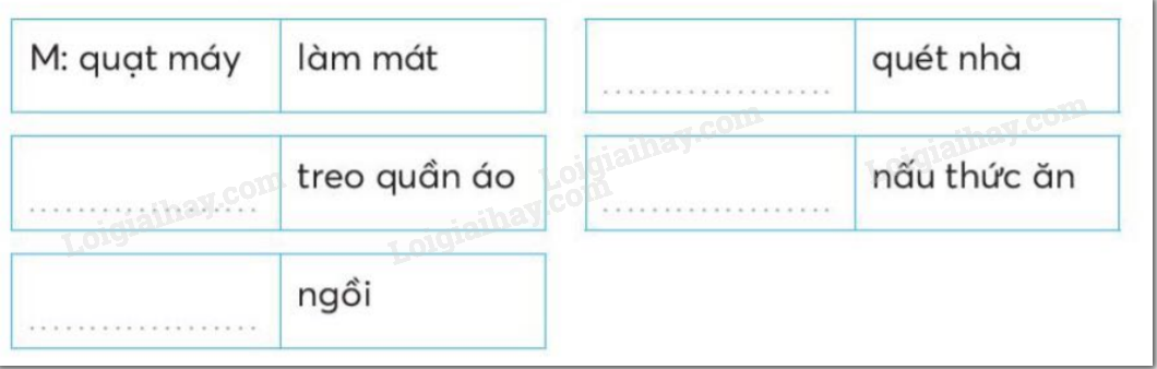 Em dựa vào từ ngữ chỉ công dụng của đồ vật, hoạt động của con người ở cột bên phải để tìm những từ chỉ sự vật thích hợp và điền vào chỗ trống.