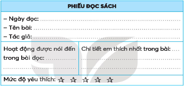 Đọc câu chuyện, bài văn, bài thơ,… về những hoạt động yêu thích của trẻ em (xem phim, xem xiếc, tham quan, dã ngoại,…) và viết thông tin vào phiếu đọc sách.