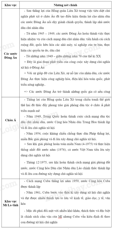 Lập bảng tóm tắt những nét chính về sự phát triển của chủ nghĩa xã hội ở các nước Đông Âu, châu Á và khu vực Mỹ La-tinh từ sau Chiến tranh thế giới thứ hai