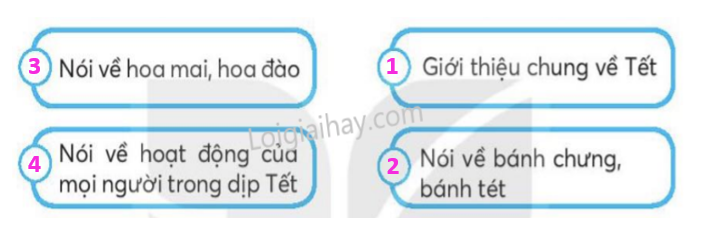 Sắp xếp các ý dưới đây theo trình tự các đoạn trong bài đọc. Tìm trong bài những từ ngữ miêu tả. Viết một câu giới thiệu về loài hoa em thích. Giải ô chữ. Điền g hoặc gh vào chỗ trống. Chọn a hoặc b. Quan sát các tranh và điền vào bảng ở dưới. Viết một câu hỏi và một câu trả lời về việc em thường làm trong dịp Tết. Em hãy viết và trang trí một tấm thiệp chúc Tết gửi cho một người bạn hoặc người thân ở xa.