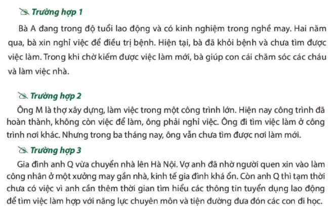 – Đọc các trường hợp và nhận xét về khả năng tìm việc làm, lí do chưa tìm được việc làm của mỗi chủ thể trong các trường hợp đó.