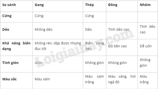 Hãy lập bảng so sánh các tính chất như cứng, dẻo, khả năng biến dạng, tính giòn và màu sắc của các kim loại sau: gang, thép, đồng, nhôm.