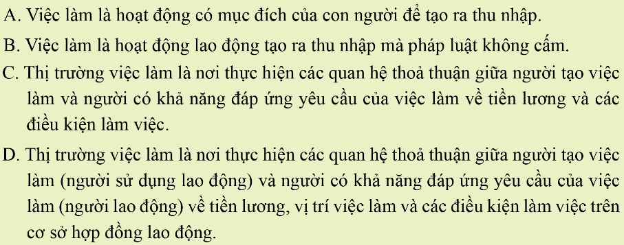 + Nhận định C sai vì thị trường việc làm là nơi thực hiện các quan hệ thoả thuận giữa người tạo việc làm và người có khả năng đáp ứng yêu cầu của việc làm về tiền lương, vị trí việc làm và các điều kiện làm việc trên cơ sở hợp đồng lao động.