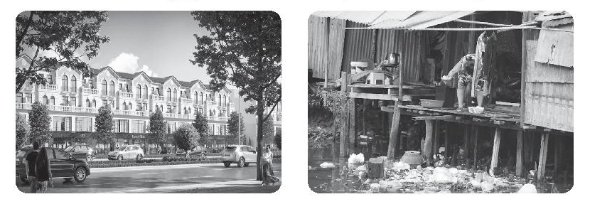2 bức tranh cho thấy sự khác biệt đối lập giữa một bên là đô thị xa hoa, với biệt thư, xe cộ, đường xá khang trang. Một bên là khu nhà sàn sập xệ trên sông đầy rác => bất bình đẳng.
