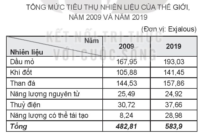 Bảng số liệu thể hiện cơ cấu tiêu thụ năng lượng thế giới năm 2009 và 2019