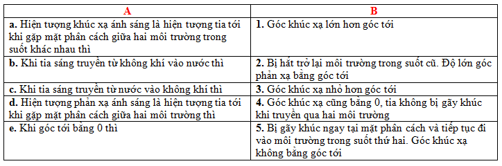 Khi tia sáng truyền từ không khí sang các môi trường trong suốt rắn, lỏng khác nhau thì góc khúc xạ nhỏ hơn góc tới.