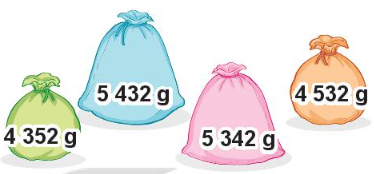 So sánh cân nặng của bốn túi hạt dẻ rồi sắp xếp theo thứ tự từ lớn đến bé.