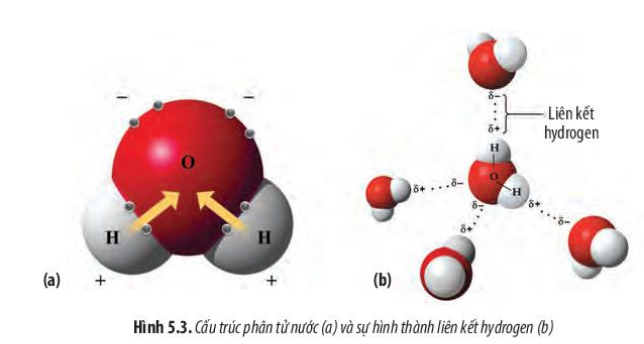 5. Quan sát Hình 5.3a và cho biết các nguyên tử cấu tạo nên phân tử nước mang điện tích gì. Tại sao? Tính phân cực của phân tử nước là do đầu?