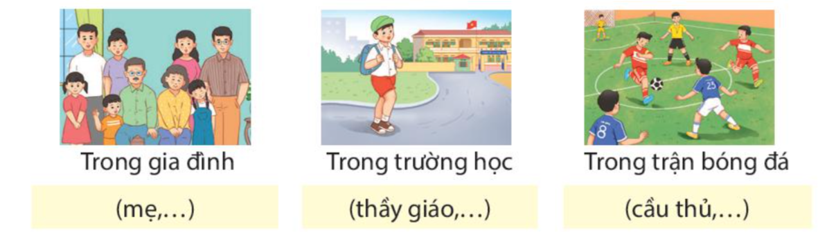 Trong gia đình: mẹ, bố, ông, bà, anh, chị, em, cháu,..