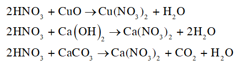 Viết phương trình hoá học của các phản ứng khi cho dung dịch HNO3 tác dụng với CuO, Ca(OH)2, CaCO3. Các phản ứng này có phải phản ứng oxi hoá — khử không? Giải thích.