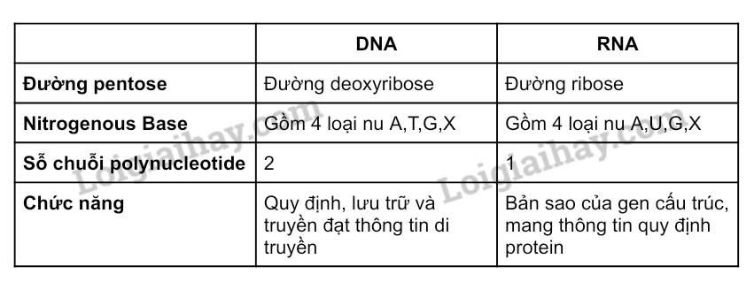 Lập bảng phân biệt DNA và RNA về đường pentose, nitrogenousbase, số chuỗi polynucleotide, chức năng.