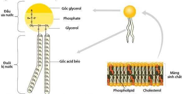 Phospholipid là phân tử gồm một đầu ưa nước (chứa gốc phosphate liên kết với gốc ưa nước) và hai đầu kị nước.
