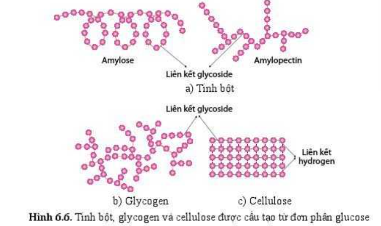 Quan sát hình 6.6 và nêu những đặc điểm giống nhau giữa tinh bột và glycogen, những đặc điểm khác nhau giữa tinh bột và cellulose về cấu tạo mạch carbon. Những đặc điểm này có gì liên quan đến chức năng dự trữ của tinh bột, glycogen và chức năng cấu trúc của cellulose?