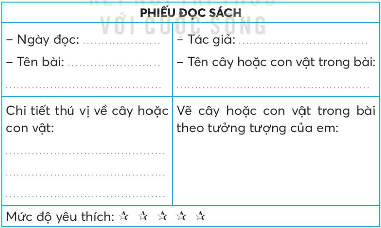 Đọc bài Tiếng vườn hoặc tìm đọc câu chuyện, bài văn, bài thơ,… về cây cối, muông thú,… và viết thông tin vào phiếu đọc sách.