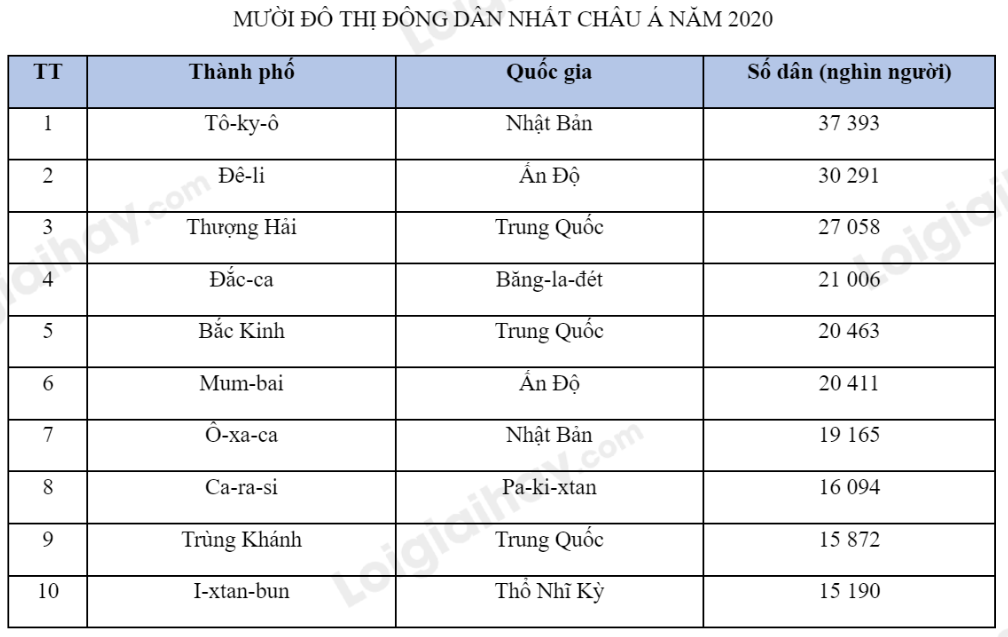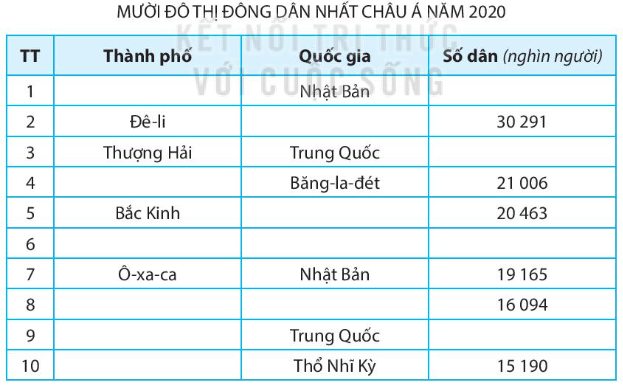 Em hãy dựa vào Bảng 2. Số dân của một số đô thị lớn ở châu Á, năm 2020 Tr. 117 – SGK