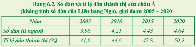 Dựa vào bảng 6.2, em hãy nhận xét sự thay đổi số dân và tỉ lệ dân thành thị của châu Á trong giai đoạn 2005 – 2020.