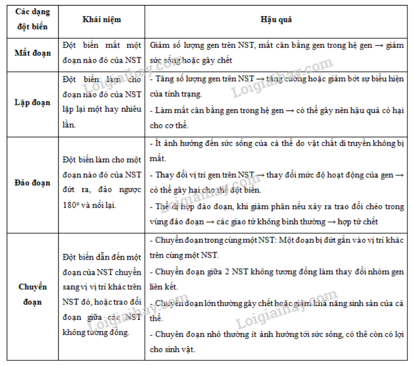 Lý thuyết các dạng đột biến cấu trúc nhiễm sắc thể.