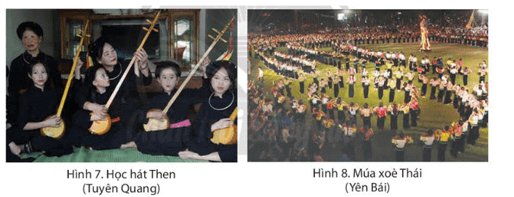 Đọc thông tin và quan sát các hình 7, 8, em hãy kể tên một số loại hình múa hát dân gian tiêu biểu ở vùng Trung du và miền núi Bắc Bộ.