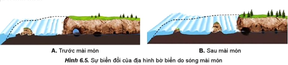 – Quá trình bóc mòn do sóng biển (mài mòn): tạo thành các vách biển, hàm ếch, nền mài mòn,…