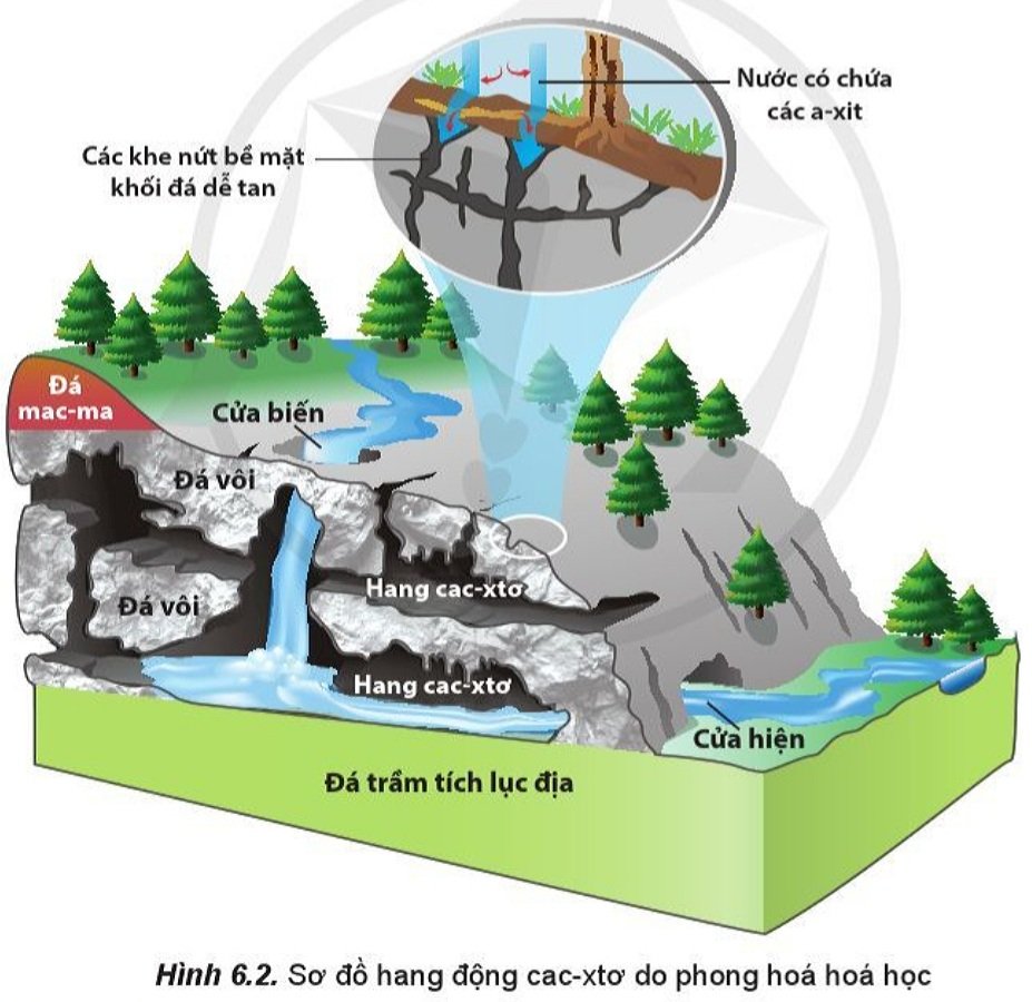 + Diễn ra mạnh trong điều kiện khí hậu nóng ẩm. Ví dụ: các hang động đá vôi ở Việt Nam (Động Phong Nha – Kẻ Bảng,…).
