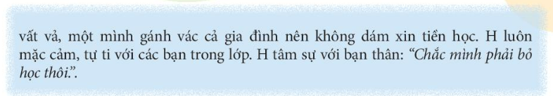 Nguyên nhân gây căng thẳng cho H: gia đinh có hoàn cảnh khó khăn, bố H bị tai nạn nên mẹ bạn vào viện chăm sóc bố mỗi ngày. Mẹ phải gánh vác mọi thứ trong gia đình nên bạn thương mẹ. Vì không dám xin tiền học nên H đã cảm thấy rất mặc cảm và tự ti về bản thân và bạn có ý định bỏ học để phụ giúp mẹ