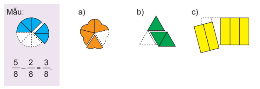 – Quan sát hình vẽ rồi viết phép trừ hai phân số.