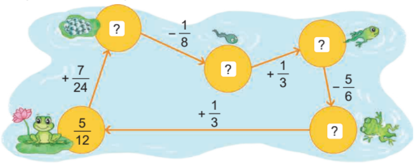 Thực hiện tính kết quả các phép tính cộng, trừ phân số theo mũi tên.