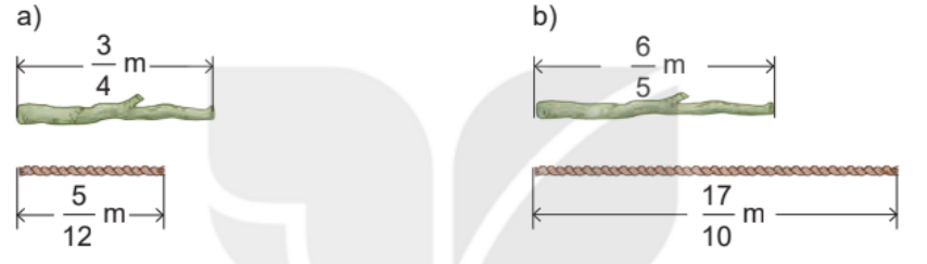 b) Sợi dây dài hơn cây gậy và dài hơn số mét là: $\frac{{17}}{{10}} – \frac{6}{5} = \frac{1}{2}$(m)