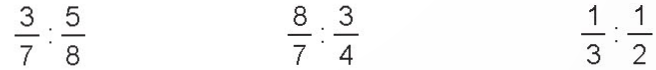 b) \(\frac{3}{7}:\frac{5}{8} = \frac{3}{7} \times \frac{8}{5} = \frac{{24}}{{35}}\,\)