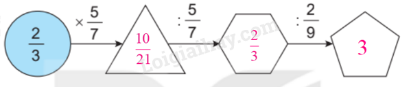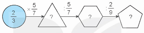 Thực hiện tính kết quả các phép tính theo chiều mũi tên rồi điền phân số thích hợp vào ô trống.