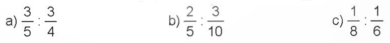 a) \(\frac{3}{5}:\frac{3}{4} = \frac{3}{5} \times \frac{4}{3} = \frac{{12}}{{15}} = \frac{4}{3}\,\)