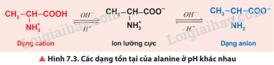 Quan sát Hình 7.3, cho biết alanine tồn tại chủ yếu ở dạng ion nào trong dung dịch ở pH khác nhau.