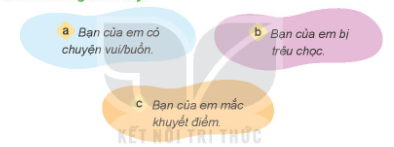 b. Với tình huống này em có thể xây dựng kịch bản em thấy bạn mình bị trêu chọc, em đứng ra bảo vệ bạn khỏi những người đang trêu chọc bạn. Đồng thời, em an ủi và chia sẻ với bạn để bạn không cảm thấy buồn