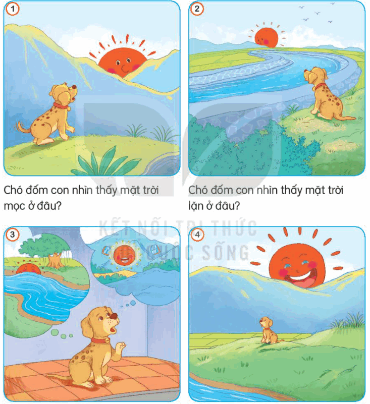 Một buổi sáng, chó đốm con nhìn thấy mặt trời mọc từ chân núi phía đông. Cả ngày hôm ấy, nó quan sát mặt trời rất chăm chú, từ lúc mặt trời mọc đến lúc mặt trời lặn xuống dòng sông phía tây. Chó đốm con nghĩ bụng: “Ơ, sao mặt trời không quay về phía đông nhỉ? Có lẽ mặt trời có hai cái nhà, sáng mai mặt trời sẽ mọc từ dòng sông phía tây, đến chiều sẽ về ngôi nhà dưới chân núi. Vậy thì sáng mai mình sẽ đến bờ sông đợi mặt trời.”. Nghĩ vậy, chó đốm con vui vẻ chạy về nhà.