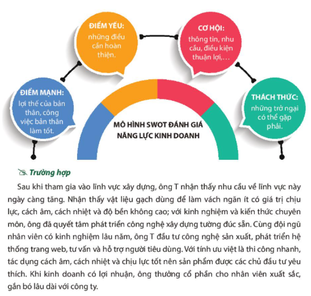 – Quan sát mô hình, đọc trường hợp và nêu được những điểm mạnh, điểm yếu, cơ hội và thách thức của ông T trong kinh doanh trong trường hợp đó.