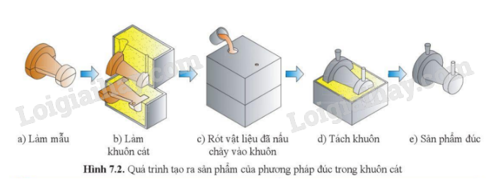 Quan sát hình 7.2 và cho biết quá trình tạo ra sản phẩm của phương pháp đúc trong khuôn cắt.
