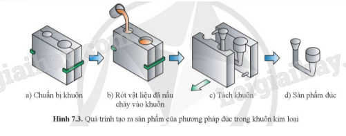 Quan sát hình 7.3 và cho biết quá trình tạo ra sản phẩm của phương pháp đúc trong khuôn kim loại.