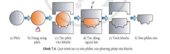 Quan sát hình 7.6 và cho biết quá trình tạo ra sản phẩm của phương pháp rèn khuôn.