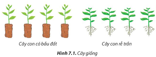 Quan sát vào hình7.1 ta thấy 2 hình thức trồng cây là cây con có bầu đất và cây con rễ trần.