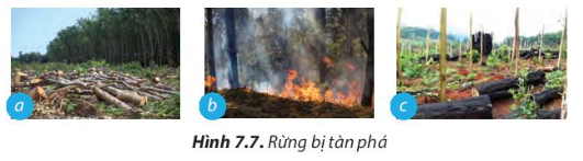 Quan sát vào hình 7.7 ta thấy hình a – rừng bị chặt phá, hình b – rừng bị cháy, hình c – rừng bị lấn chiếm để trồng cây khác.