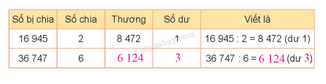 Lấy số bị chia chia cho số chia rồi điền giá trị của thương và số dư vào ô trống.