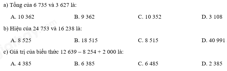 a) Để tìm tổng của hai số ta thực hiện phép cộng: 6 735 + 3 627.