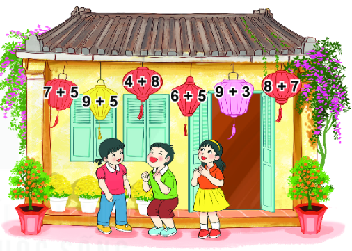 b) Các phép tính ở đèn lồng màu đỏ là: 7 + 5 ; 4 + 8 ; 6 + 5 ; 8 + 7.