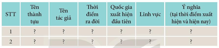 2. Lập bảng thống kê những thành tựu cơ bản của các cuộc cách mạng công nghiệp thời kì hiện đại theo gợi ý sau: