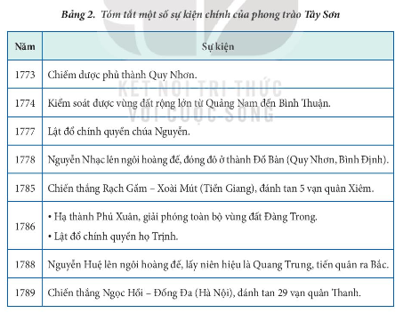 Khai thác Bảng 2 (tr.56) và lược đồ hình 6, trình bày diễn biến chính của phong trào Tây Sơn